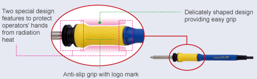 Composite-type soldering iron which has an iron tip with a built-in heater.Features the versatility to enable the soldering of a variety of components ranging from large scale components such as power supply boards, heat sinks, shield cases and coaxial cables, which require a high amount of heat, to micro components mounted on multilayer boards. While providing high heat capacity, the grip is thin and easy to hold, exactly as the FM-2027,and provides two design features that protect users' hands from high radiation heat.