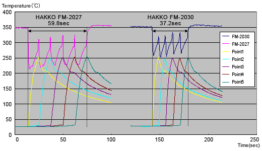16 types of tips are available(T22 Series) This lineup enables soldering of components of various sizes ranging from micro to large components. Working characteristics comparison graph High-powered soldering iron also contributes to reductions in production time.