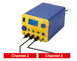 Combined use with HAKKO FM-206 with a large LCD panel High heat capacity soldering iron intended for exclusive use with the compact multi-rework station, HAKKO FM-206 that enables simultaneous use of three handpieces To work with this handpiece(HAKKO FM-2030), connect it to the Channel 2 or 3 receptacle on HAKKO FM-206 ![]() ![]()  |