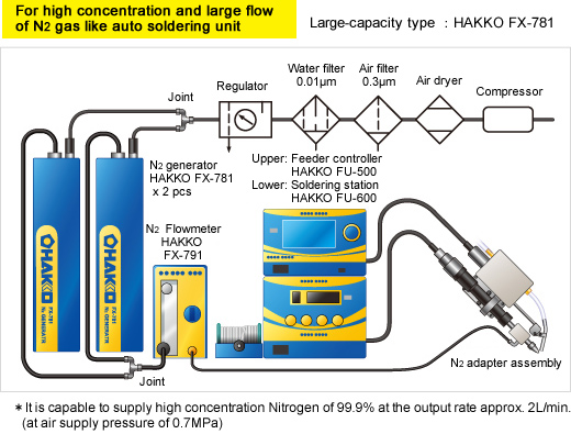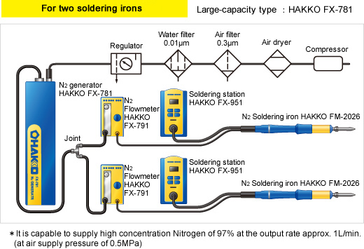 Highest concentration of nitrogen gas: 99.9% Non-electrical compressed air delivers N2 gas HAKKO FX-781 large-capacity type accepts 2 soldering irons and capable of creating high concentration and large flow of N2 gas. Performance Table of HAKKO FX-780